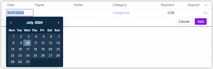 Manually adding transactions can be done by clicking on Add New. The Payee and the Category fields will provide a dropdown menu of available options. You can add new payees directly from this view, but if you need to add a new category, you can only do so from the Budget View.